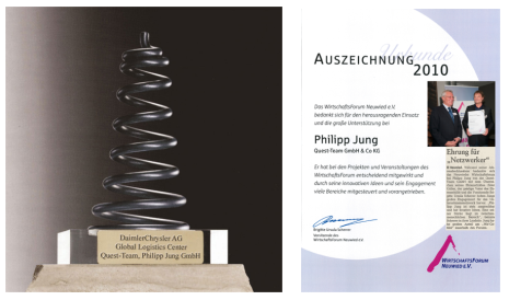 Für die innovative, oft auch ehrenamtliche Zusammenarbeit und regionale Mitwirkung wurden Philipp Jung und das Quest-Team 2010 mit dem Innovationspreis des Wirtschafts-Forum Neuwied ausgezeichnet.